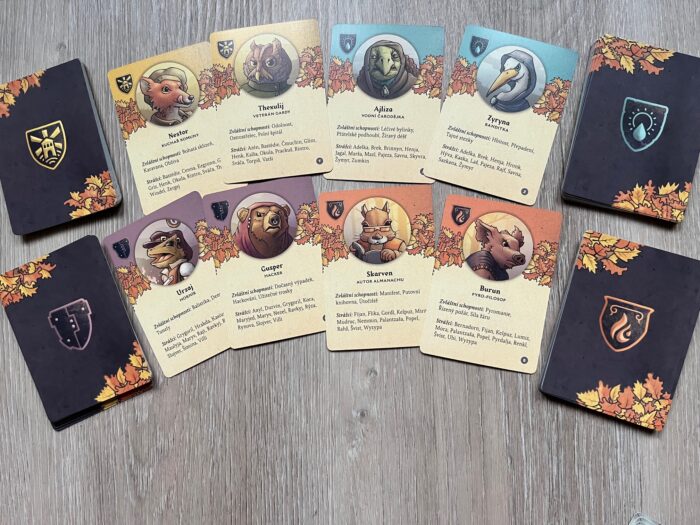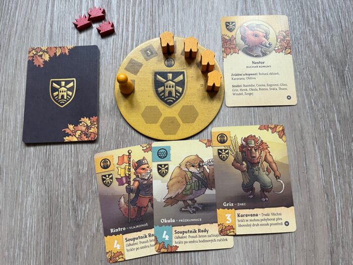 Pro každého hráče, respektive pro každou frakci, je připravena kromě desky i sada dřevěných figurek – dvojice potištěných vůdců, tábory a podpora, stejně jako karty vůdců a strážců. Tady musím zmínit, že jednotlivé frakce jsou vyvedeny v pěkných „přírodních“ barvách korespondujících s jejich domovskými prostředími v lese (pláně, lesy, bažiny a hory) a barevný styl hře sluší.