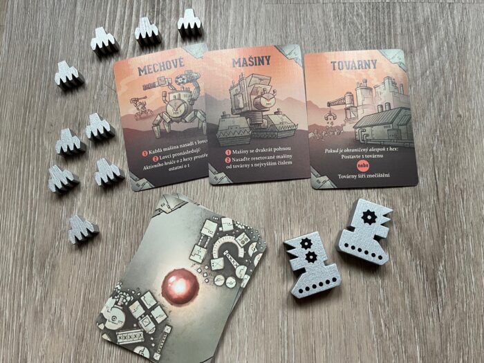 Na počátku partie si zvolíte obtížnost hry – ta je jednoduše škálována dle použitých karet strojů. Ne, nehrajte si zbytečně na hrdiny a začněte hezky pozvolna. Následně připravíte herní plán z hexových a okrajových dílků, rozmístíte protivníky v podobě strojů, zdí a mašin a každý z hráčů si vybere svou frakci, vezme si její komponenty, zvolí jedinečného vůdce a připraví balíček karet strážců, kterými během hry následně provádí akce. Příprava hry je řekněme středně dlouhá, nic náročného a během pár minut se můžete vrhnout do boje.
