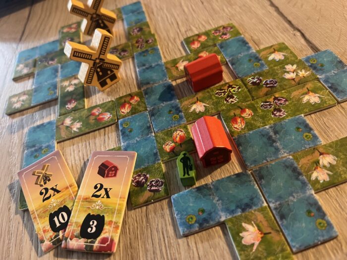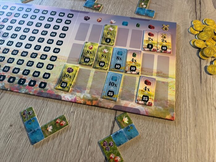 Hra je hrána na přesně 10 kol, která jsou rozdělena na tahy hráčů a ty na 3 povinné a dvě volitelné akce. Jakmile je hráč na tahu, musí nejprve posunout žeton květiny kolem plánu a vzít si jeden z dílků krajiny. Může dojít libovolně daleko, ale za každý přeskočený dílek musí utratit minci, což není úplně příjemná penalizace. Následně hráč novým dílkem rozšíří svou zahradu, přičemž platí, že dílek lze libovolně obracet a převracet, ale musí navazovat na dílky z předchozích kol. Nelze tak budovat třeba dvě separátní plochy, což by však stejně bylo nelogické. A teď základní herní twist! V podobných tetrisových a tile placementových hrách jsme zvyklí, že cílem je skládat dílky k sobě a ideálně bez mezer. Jenže v případě Třpytivých květů naopak mezery vytvářet chcete, protože do těch lze následně přidávat speciální prvky (pracovníky, stodoly, mlýny dle velikosti a tvaru), za což se získává nemalá porce bodů. Každopádně jakmile je dílek přiložen, musí si hráč vybrat jednu kartu z ruky, zahrát jí a tím bodovat. Každá karta boduje buď jeden prvek dvěma body, nebo dva po bodu. A jak se boduje? Jednoduše hráč spočítá prvky na novém dílku, sečte je se spojenými z dřívějších kol a vynásobí počtem bodů. Jednoduché, svižné a efektivní. Ale věřte mi, že šikovně chytré a přemýšlivé, protože každou bodovací kartu máte jen jednou a je důležité správně vyhodnotit adekvátní časování, kdy jí použít.