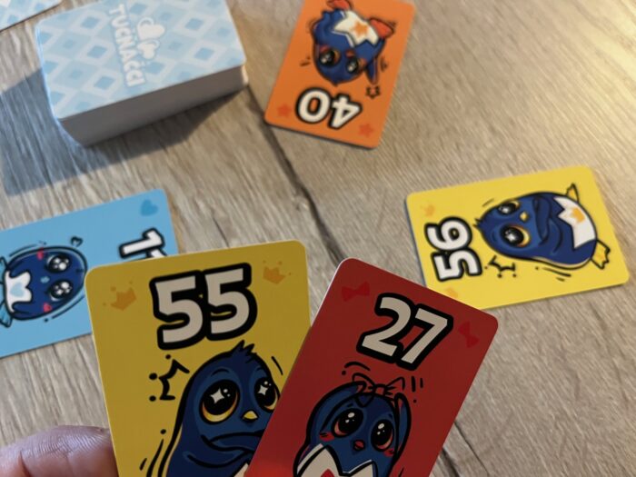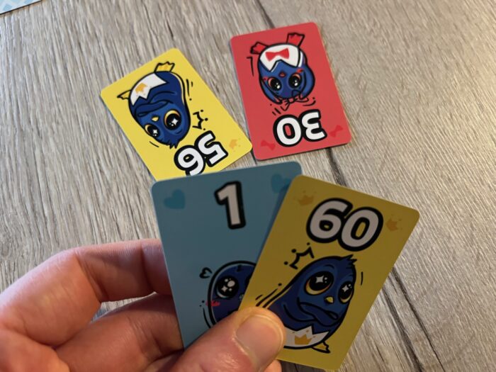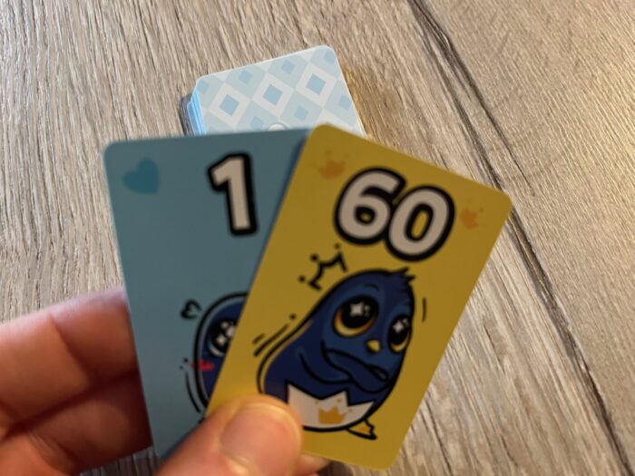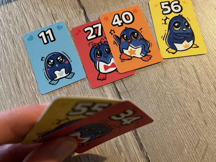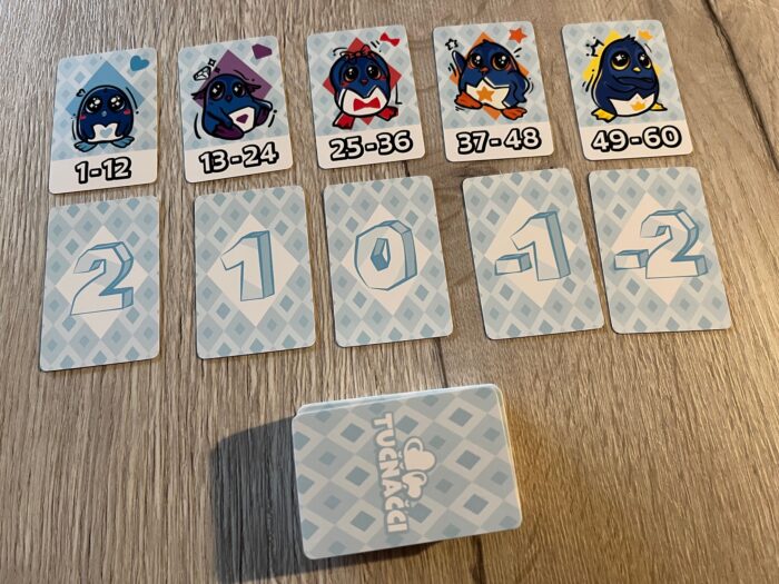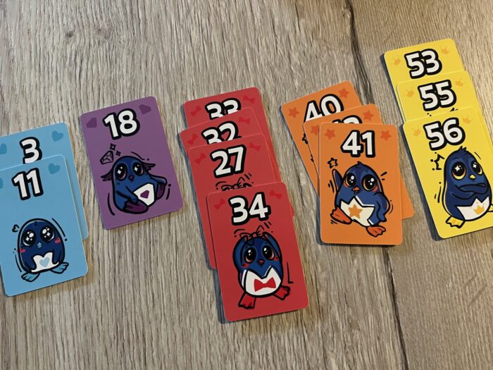 Důležitým prvkem Tučňáčků jsou karty barev a hodnot. Na začátku hry uděláte z obou řadu, přičemž modrý (nejmenší hodnoty) tučňák dostává dvojku, naopak žlutý (největší) mínus dvojku. Tedy lze hodnoty nastavit i náhodně, ale v základu je to takto. Každý hráč dostane za zamíchaného balíčku dvě karty do ruky. Nebo tři, pokud hrajete upravenou variantu. A může se začít.