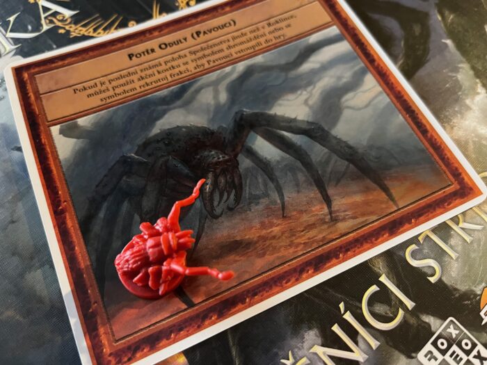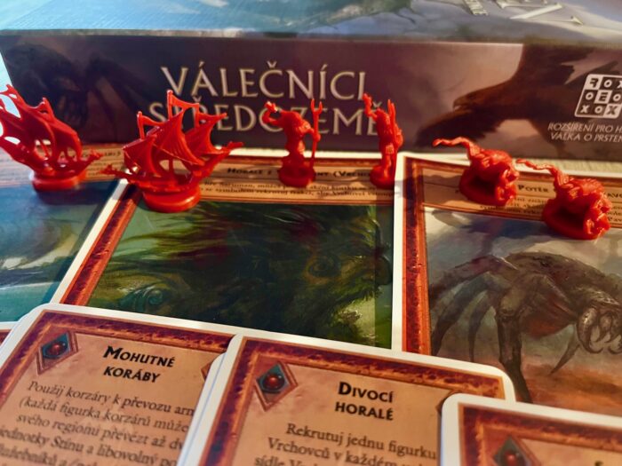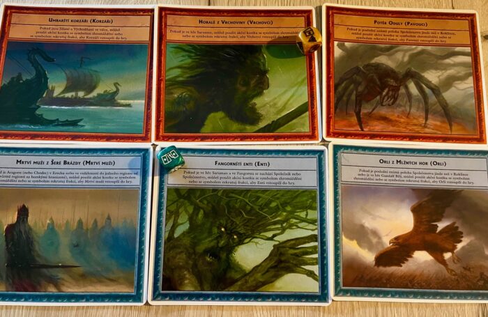 Frakce nejsou od začátku ve hře, nemusíte s nimi počítat při setupu (respektive je dáte bokem i s jejich vybavením). Jsou totiž parádně tematické a do hry vstupující za splnění zvláštních pravidel, které je třeba splnit, a která se nacházejí na jejich kartách. Mrtvé muže tak může přivést do boje jen Aragorn nacházející se kolem Erechu, Enti slyší na volání společenstva a jeho členů ve Fangornu, Umbarští korzáři vyslyší volání svých bratří z východu a pavouci, nebo-li Potěr Oduli se na lov vypraví už ve chvíli, kdy Společenstvo zmizí z roklinky. Frakce nejen že do hry nevstupují stejně jako normální armády a jednotky, ale ani stejně nefungují a jejich využití ve střetech a bitvách závisí na zvláštních kartách a jejich využití. Osobně musím říct, že se mi tenhle systém ve hře tematicky velmi líbí, protože když si vzpomenu na Pána prstenů, žádná z uvedenžch frakcí se nechovala zcela řekněme standardně, byť mrtvé armády i korzáři se zapojili částečně do Bitvy na Pelennorských polích a muži z Vrchoviny na volání Sarumana vyrazili pro Rohanu. Každopádně ve hře se jedná spíše o strategicky podpůrné a lstivě využitelné armády a pomocníky.