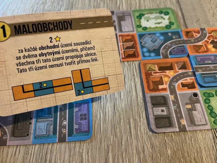 Velkoměsto, i když název svádí k něčemu jinému, je minimalistická, malá karetní hra, která se skrývá v roztomilé barevné krabičce se staveništěm, silnicí i hrdě se tyčícím městem. Kromě jednoduchých krátkých pravidel najdete v krabičce několik sad karet – jednak 18 karet základních, které jsou oboustranné, z jedné strany je každá karta rozdělena na 4 barevná pole různě protkaná silnicemi, na straně druhé pak originální bodovací podmínka, která body, které je nutné získat pro vítězství, ale i samotný bodovací úkol. To ale zdaleka není vše, protože Velkoměsto obsahuje hned 5 různých menších rozšíření, což zaručuje další obří porci variability a znovuhratelnosti. Celkově se mi moc líbí barevná a přehledná grafika, i drobné detaily na jednotlivých kartách nebo použitá ikonografie, která pomáhá s plynulou hratelností.