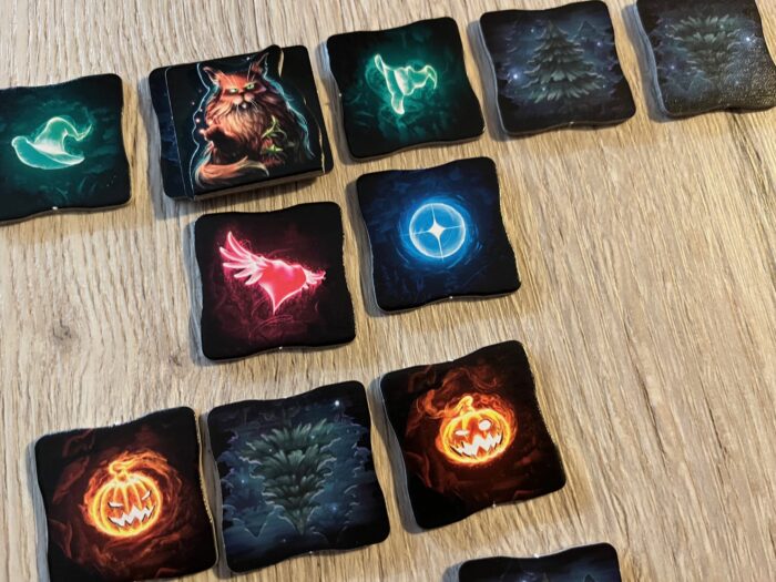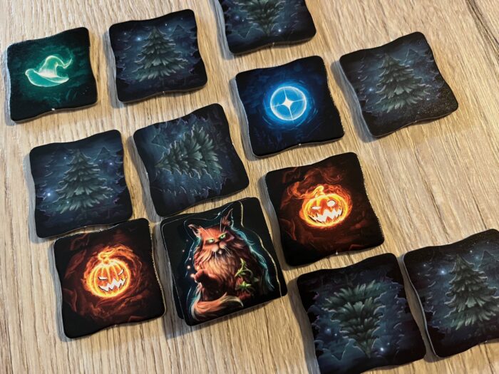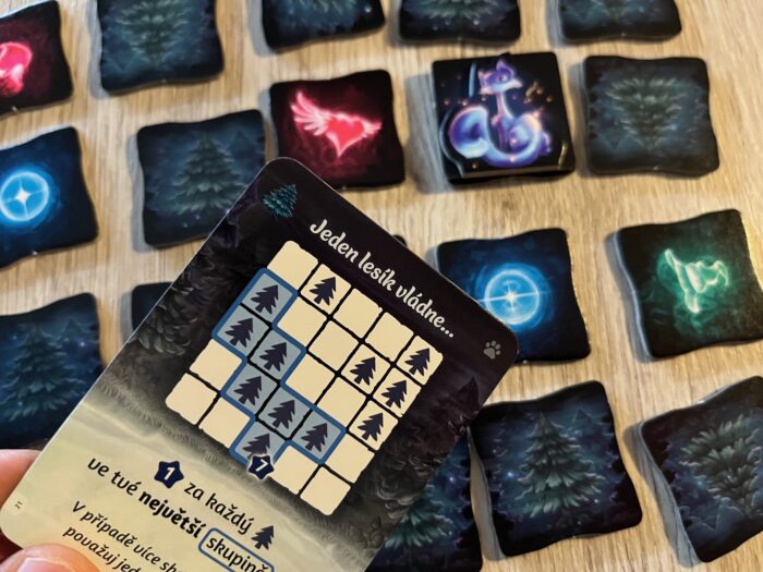 Zářihvozd je doslova zářivou hrou, která svým grafickým zpracováním vystupuje do popředí, a to už ve zpracování krabice s pestrobarevnými bludičkami a kočkou. A v podobném duchu se nese i herní obsah, kterému dominuje přes 150 dílků bludiček/stromů – každá strana obsahuje buď jedno nebo druhé, ale také 25 bodovacích karet přání po pěti pro každou kategorii, centrální plán v podobě variabilní tůňky, a destičky koček, které jsou naprosto stylově udělány tak, že jakmile je ve hře využijete pro jejich speciální akci, žeton otočíte a kočka se doslova schovává za stromem. Jasně, je to herně nevýznamný detail, ale graficky moc milý a povedený. Co je naopak šikovné a praktické, to jsou kartonové ukazatel rozměru sestavované mřížky, tak aby hráči zachovali její rozsah v jednotlivých kolech.