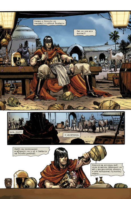 Po její ztrátě se ze zachmuřeného barbara stal ještě zachmuřenější, nasávající po putikách a hospodách a litující své ztráty. A osud ho zavádí do písčitého království Kúš, kam ho zavádí nový autor série Fred Van Lente. Zde by se Conan utápěl nejraději na dně kovových pohárů v čím dál větším množství alkoholu, ale nebyl by to náš milovaný cimmeřan, pokud by se nezapletl do místního dění plného intrik, boje o moc, čarodějů a vařícího se nespokojení obyvatel na prahu krvavé revoluce.