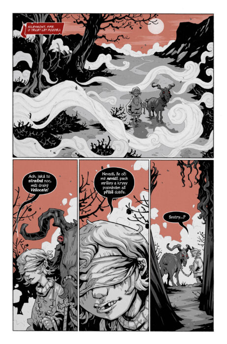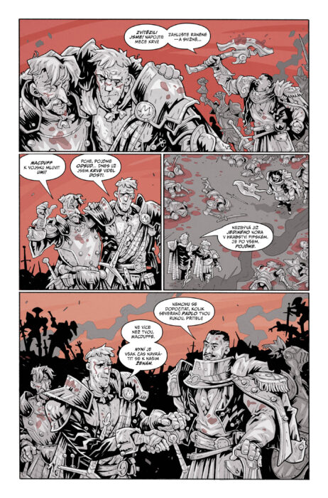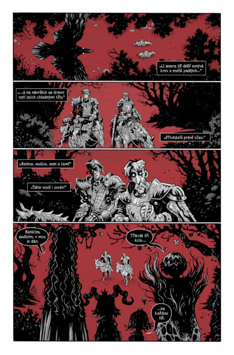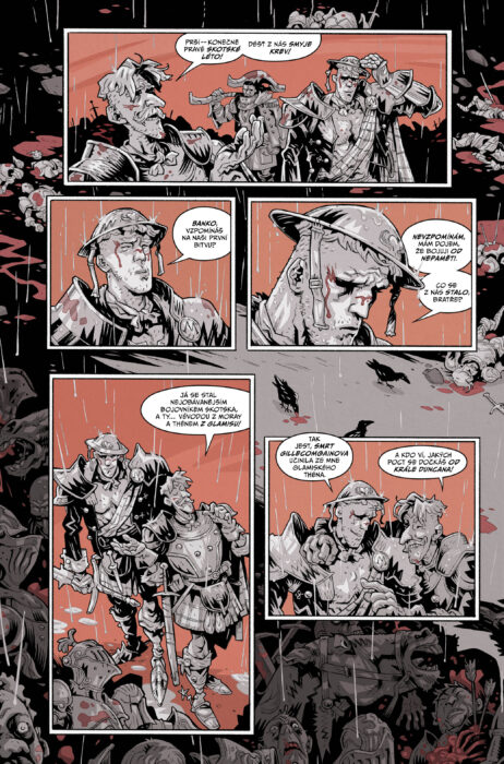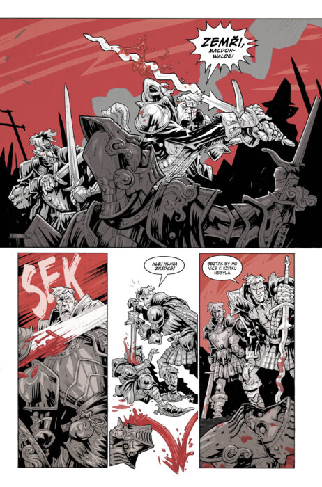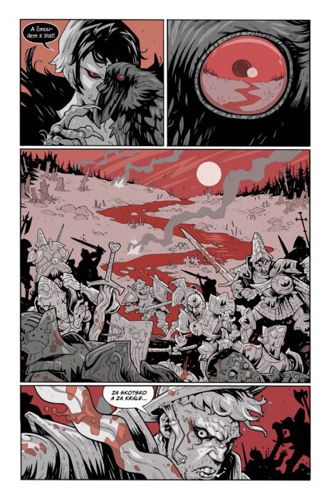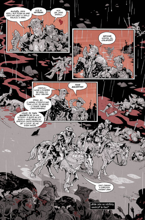A daří se jim to na výbornou! Krvavá lázeň je ukázkou skvěle fungující dvojice scénárista/kreslíř, kdy ponurou atmosféru komiksu s neodvratným tragickým vyústěným podtrhuje minimalistická kresba postavená na kontrastu tří barev. A věřte mi, Inverness ani celé Skotsko nikdy nevypadalo ponuřeji. Líbí se mi větší zapojení čarodějnic, jejich skryté plány a pikle. Naopak Lady Macbeth sice má nějaké ty chtivé narážky, nicméně to není taková svině jako v originále. Macbethovo propadání se do hlubin šílenství a dekadentních halucinací je hutné, syrové a pro čtenáře stejně fatalistické jako pro nebohého krále. Vizuální stránka je bezchybná, kompaktní a neskutečně sugestivní. Skvěle využitá hru světla a stínu se nebojí připojit temně krvavé plochy odkazující na prokletí, které se vznáší nad celým Invernessem i běsnícím králem.